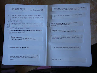 Every week we get these lists of truths that we are to use, cut out and make cards or use in our projects. I like to cut them all out and pull out the ones that speak to me and use those first. But what about the ones that don't jump out at me? Well, at first I was putting them in my little Brighton bag and then from time to time I would pull them out. But then I was seeing they still didn't speak to me and then the ones I needed to see, I was not seeing. I looked through my unused books and found this blank journal from a Matthew West concert I went to recently. I haven't done the front yet, but I will so I took a picture of what it looks like now. then what I did is I am going to collage the pages together on the inside and I have started putting the unused truths down on the blank pages. Then as I see them I can write a little note on them if I want or I can cut them out if I really want them for another project. These will be great reinforcements for me later on.